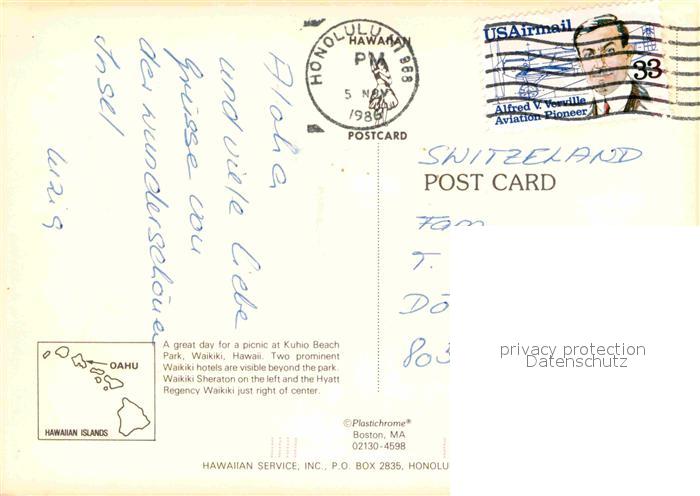 72708335 old postcard Waikiki Kuhio Beach Park postalisch gelaufen Erhaltung siehe scans [AndreD76] KatCode: 14140130000000