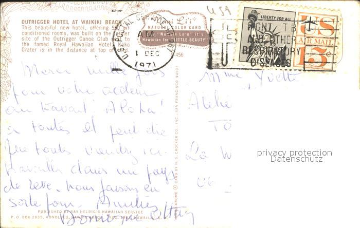 71943121 old postcard Waikiki Outrigger Hotel postalisch gelaufen Erhaltung siehe scans KatCode: 14140130000000