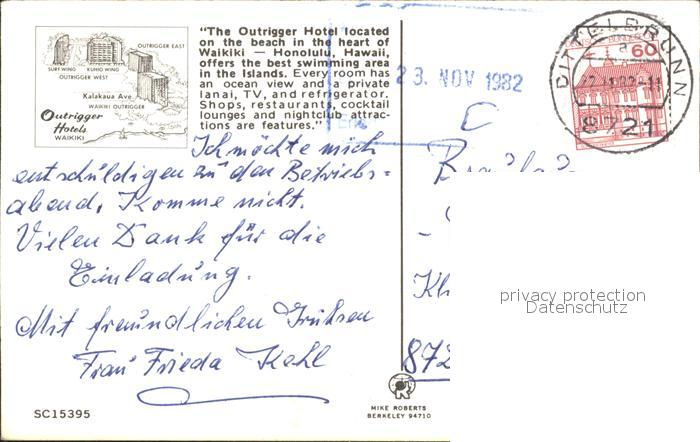 71943117 old postcard Waikiki Outrigger Hotels postalisch gelaufen Erhaltung siehe scans KatCode: 14140130000000