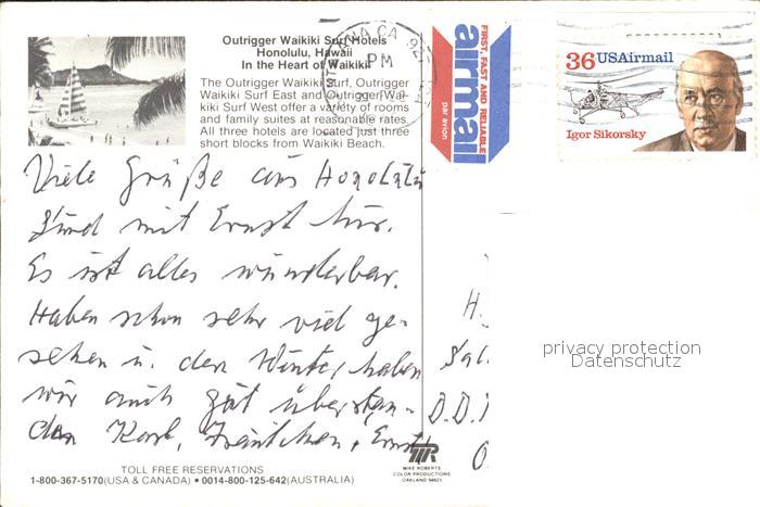 72179155 old postcard Waikiki Outrigger Waikiki Surf Hotels postalisch gelaufen Erhaltung siehe scans KatCode: 14140130000000