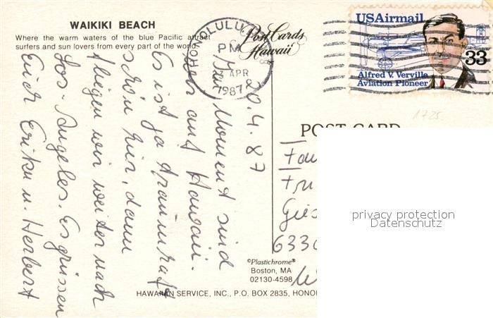 73257913 old postcard Waikiki postalisch gelaufen Erhaltung siehe scans [NatalD47] KatCode: 14140130000000