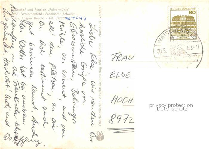 72701105 alte Postkarte Waischenfeld Gasthof Pension Pulvermuehle Fraenkische Schweiz Partie am Fluss postalisch gelaufen Erhaltung siehe scans [FriedD77] KatCode: 11110009472197