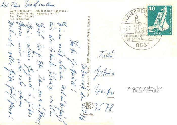 73712787 alte Postkarte Waischenfeld Waldpension Rabeneck Cafe Restaurant Burg Tal der Wiesent postalisch gelaufen Erhaltung siehe scans [FriedD77] KatCode: 11110009472197
