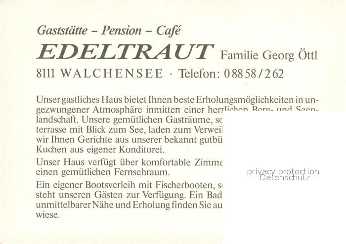 73615467 Walchensee Gasthof Pension Edeltraut Gartenterrasse Speiseraum postalisch nicht gelaufen Werbekarte (keine Postkarte) Erhaltung siehe scans [WerneD78] KatCode: 11110009173133