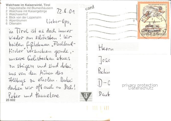 72376572 alte Postkarte Walchsee Tirol Hauptstrasse Blumenhaeuser Kaisergebirge Walchseerhof Lippenalm Alpenblumen Ottenalm postalisch gelaufen Erhaltung siehe scans KatCode: 11390335070529