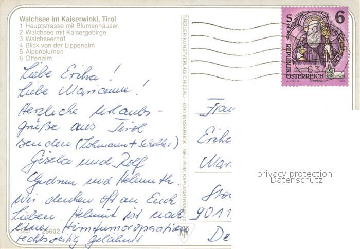 73629102 alte Postkarte Walchsee Tirol Hauptstrasse Blumenhaeuser Kaisergebirge Walchseerhof Lippenalm Alpenblumen Ottenalm postalisch gelaufen Erhaltung siehe scans [WerneD78] KatCode: 11390335070529