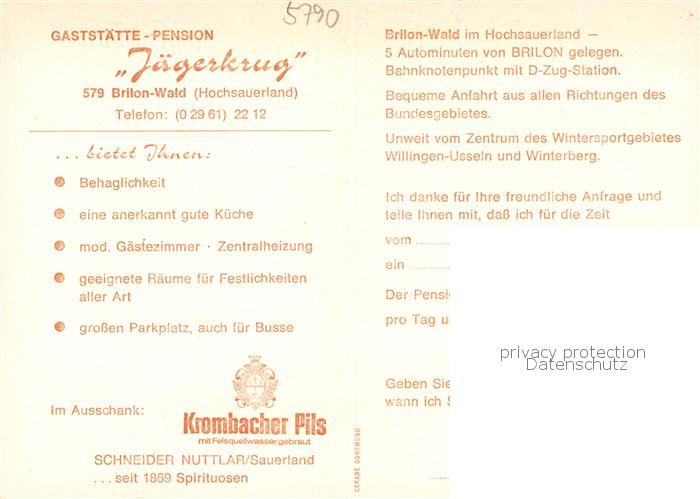 73863265 Wald Brilon Gaststaette Pension Jaegerkrug Gaststube Panorama Luftaufnahme postalisch nicht gelaufen Werbekarte (keine Postkarte) Erhaltung siehe scans [FriedD77] KatCode: 11110005958012