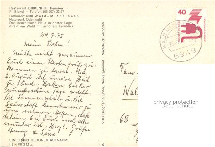 73726528 alte Postkarte Wald-Michelbach Restaurant Birkenhof postalisch gelaufen Erhaltung siehe scans [LiesaD40] KatCode: 11110006431021