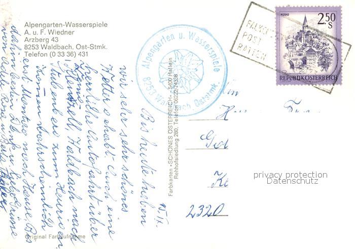 73286649 alte Postkarte Waldbach Steiermark Alpengarten Wasserspiele postalisch gelaufen Erhaltung siehe scans [KathaD81] KatCode: 11390224060747