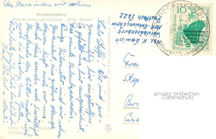 43349568 alte Postkarte Waldbaerenburg FDJ Bezirksjugendschule Willi Kluge postalisch gelaufen Erhaltung siehe scans [FriedD77] KatCode: 11110014290010