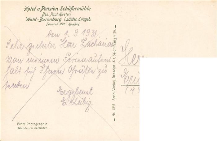 73898762 Waldbaerenburg Hotel Pension Schaefermuehle postalisch nicht gelaufen Erhaltung siehe scans [WerneD78] KatCode: 11110014290010