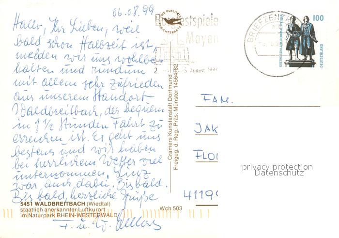 73119035 alte Postkarte Waldbreitbach Wied Fliegeraufnahme postalisch gelaufen Erhaltung siehe scans [NatalD47] KatCode: 11110007138076