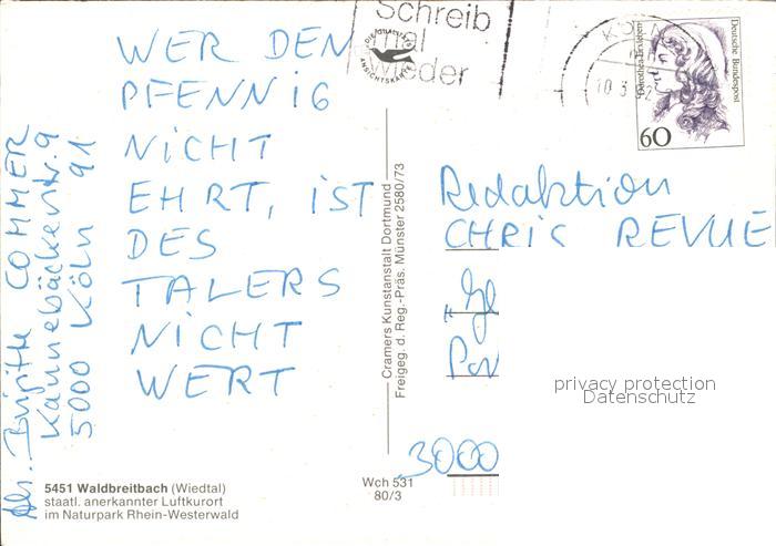 72465015 alte Postkarte Waldbreitbach Wied Fliegeraufnahme postalisch gelaufen Erhaltung siehe scans KatCode: 11110007138076