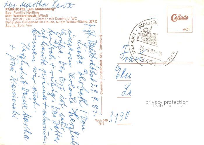 73643386 alte Postkarte Waldbreitbach Wied Panorama Parkhotel am Muehlenberg Gastraeume Hallenbad postalisch gelaufen Erhaltung siehe scans [WerneD78] KatCode: 11110007138076