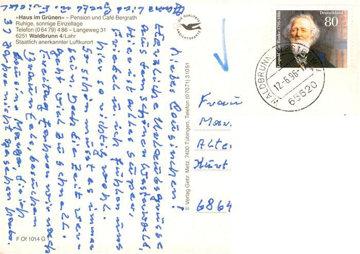73936174 alte Postkarte Waldbrunn Westerwald Haus im Gruenen Pension Bergrath Terrasse Gastraum postalisch gelaufen Erhaltung siehe scans [FriedD77] KatCode: 11110006533016