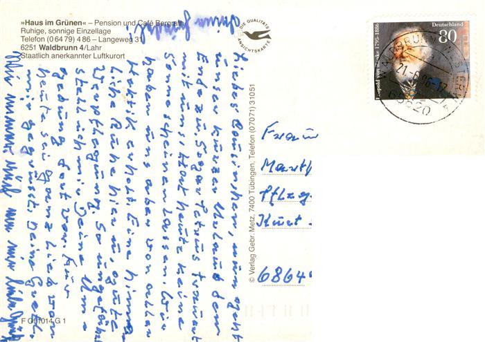 73936175 alte Postkarte Waldbrunn Westerwald Haus im Gruenen Pension Bergrath Terrasse Gastraum postalisch gelaufen Erhaltung siehe scans [FriedD77] KatCode: 11110006533016