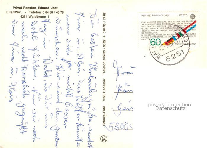 73516618 alte Postkarte Waldbrunn Westerwald Ortsansicht mit Kirche Pension Jost Waldpartie postalisch gelaufen Erhaltung siehe scans [FriedD77] KatCode: 11110006533016