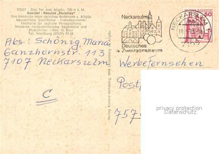 73648754 alte Postkarte Waldburg Wuerttemberg Gasthof Pension Paradies Gaststube Kegelbahn postalisch gelaufen Erhaltung siehe scans [WerneD78] KatCode: 11110008436079