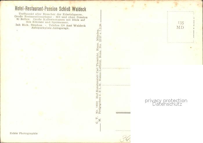 31919950 Waldeck Edersee Burg-Hotel Schloss Waldeck Fliegeraufnahme postalisch nicht gelaufen Erhaltung siehe scans KatCode: 11110006635021