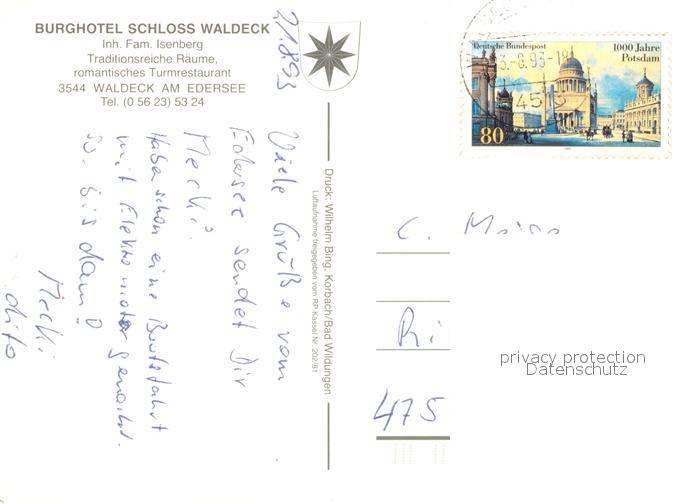 73101739 alte Postkarte Waldeck Edersee Burghotel Schloss Waldeck Fliegeraufnahme postalisch gelaufen Erhaltung siehe scans [WerneD78] KatCode: 11110006635021