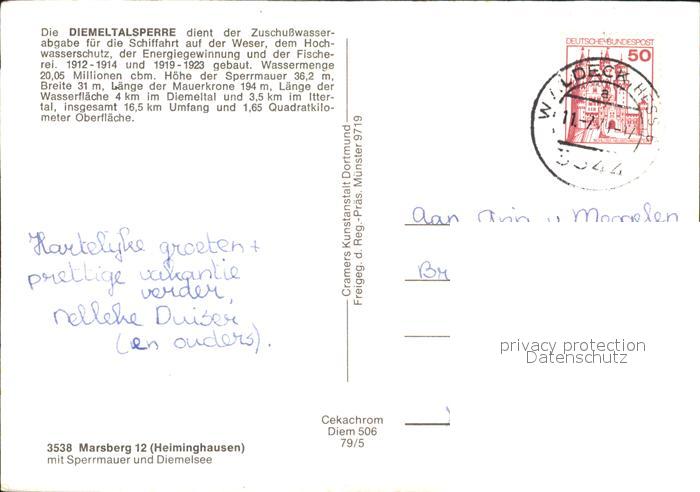 72599581 alte Postkarte Waldeck Edersee Fliegeraufnahme Diemeltalsperre postalisch gelaufen Erhaltung siehe scans [LiesaD40] KatCode: 11110006635021