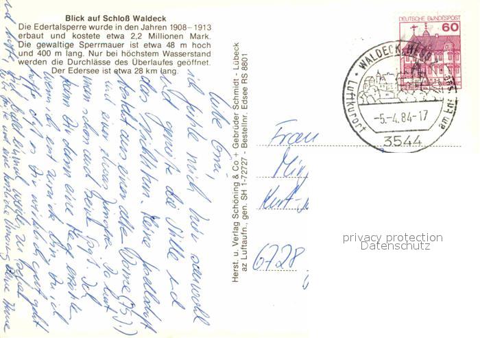 72830586 alte Postkarte Waldeck Edersee Schloss an der Edertalsperre Fliegeraufnahme postalisch gelaufen Erhaltung siehe scans [FriedD77] KatCode: 11110006635021