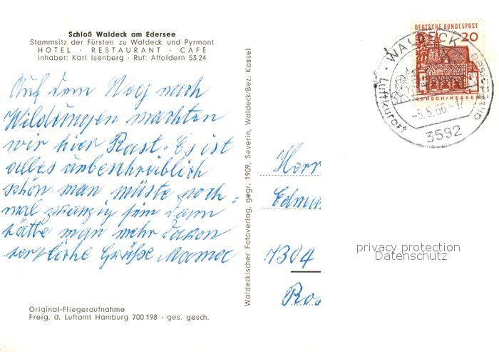 73110965 alte Postkarte Waldeck Edersee Schloss Fliegeraufnahme postalisch gelaufen Erhaltung siehe scans [NatalD47] KatCode: 11110006635021