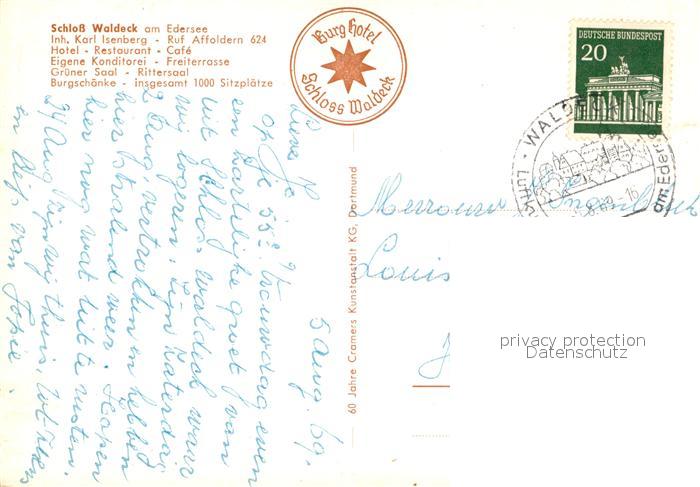 73306663 alte Postkarte Waldeck Edersee Schloss Waldeck Cafe Restaurant Gruener Saal Freiterrasse postalisch gelaufen Erhaltung siehe scans [WerneD78] KatCode: 11110006635021
