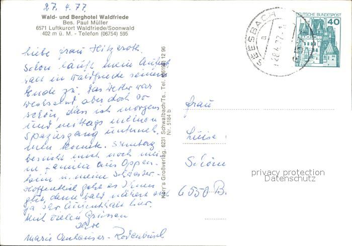 72421456 alte Postkarte Waldfriede Bad Sobernheim Wald-und Berghotel Waldfriede postalisch gelaufen Erhaltung siehe scans KatCode: 11110007133501
