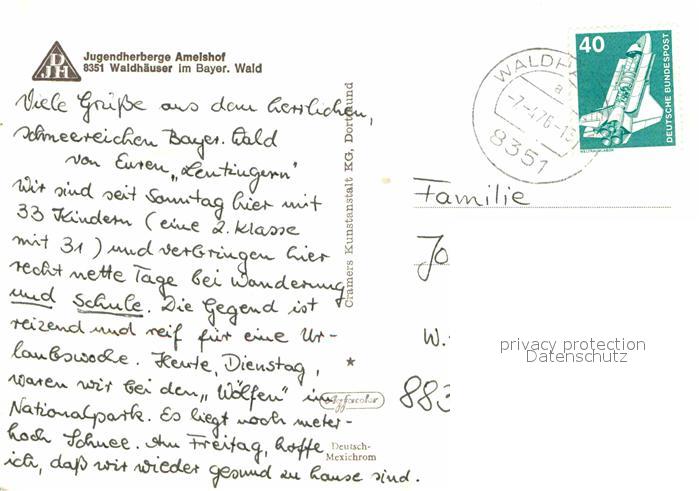 72620626 alte Postkarte Waldhaeuser Neuschoenau Jugendherberge Amelshof postalisch gelaufen Erhaltung siehe scans [LiesaD40] KatCode: 11110009272146
