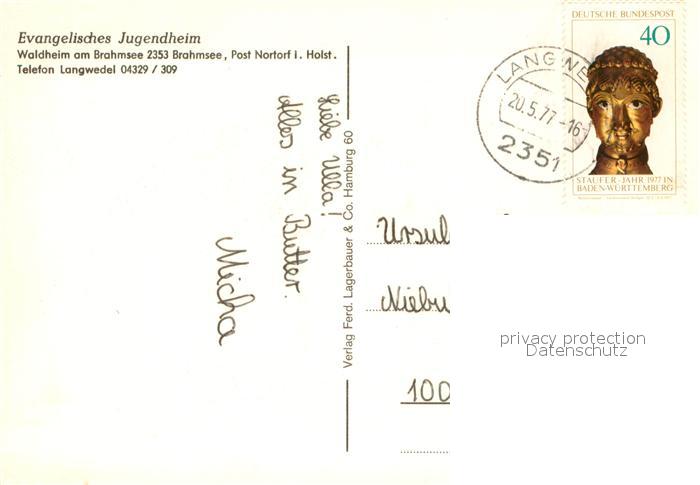 73672336 alte Postkarte Waldheim Brahmsee Fliegeraufnahme Ev Jugendheim Strand Waldweg postalisch gelaufen Erhaltung siehe scans [WerneD78] KatCode: 11110001058094