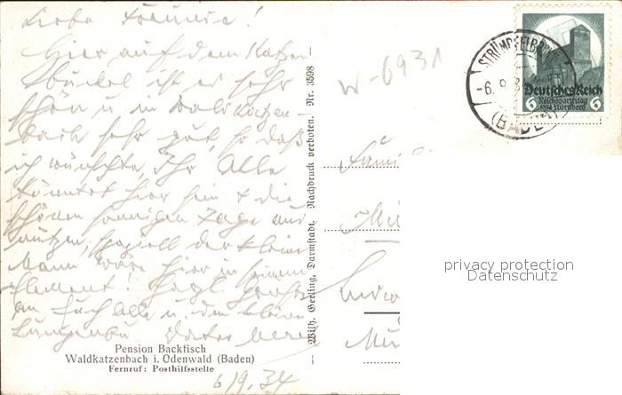 31730862 alte Postkarte Waldkatzenbach Fliegeraufnahme Pension Backfisch postalisch gelaufen Erhaltung siehe scans KatCode: 11110008225118