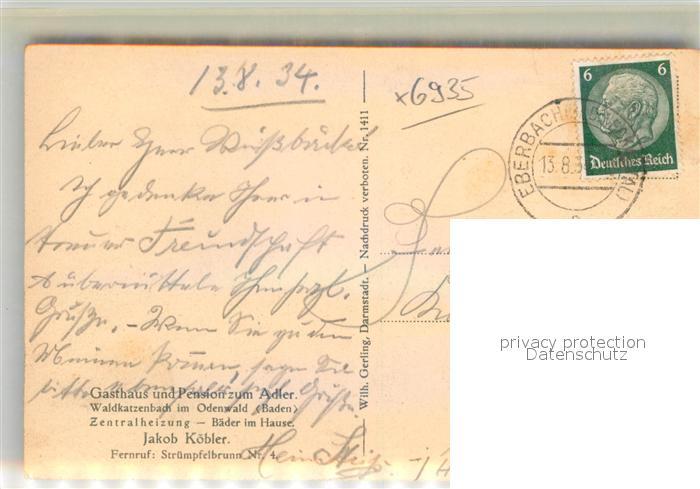 42932826 alte Postkarte Waldkatzenbach Gasthof Pension Adler postalisch gelaufen Erhaltung siehe scans [AndreD76] KatCode: 11110008225118