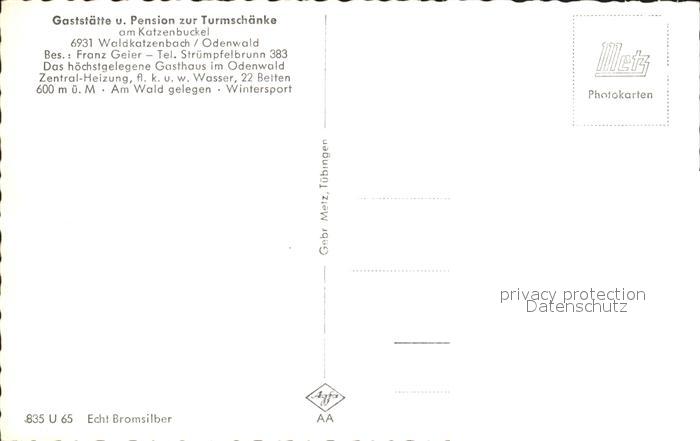 72096257 Waldkatzenbach Gaststaette Pension Zur Turmschaenke postalisch nicht gelaufen Erhaltung siehe scans KatCode: 11110008225118