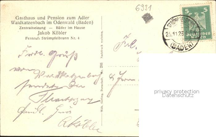72095796 alte Postkarte Waldkatzenbach Oberer Hoellgrund Gasthaus Pension zum Adler postalisch gelaufen Erhaltung siehe scans KatCode: 11110008225118