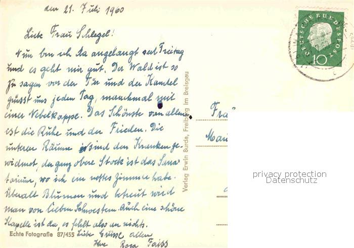 72831389 alte Postkarte Waldkirch Breisgau Bruder-Klaus-Krankenhaus postalisch gelaufen Erhaltung siehe scans [PaolaD17] KatCode: 11110008316056