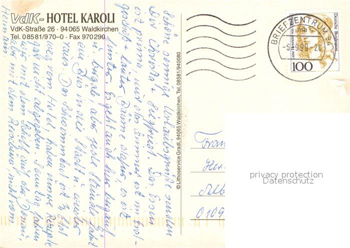 73725531 alte Postkarte Waldkirchen Niederbayern VdK Hotel Karoli Stadtpanorama postalisch gelaufen Erhaltung siehe scans [FriedD77] KatCode: 11110009272151