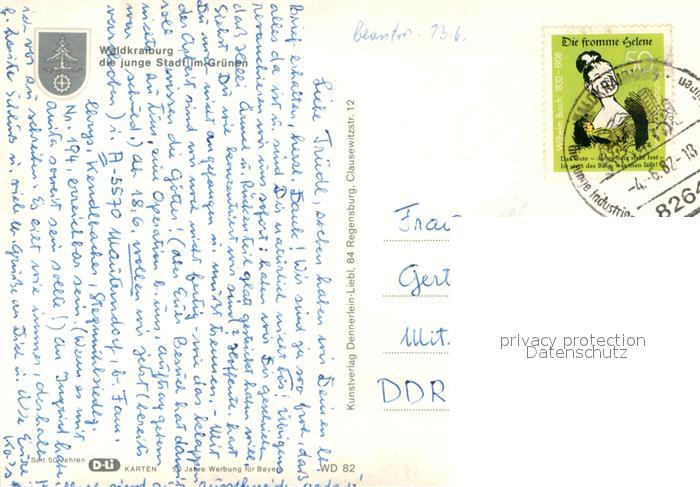 73737101 alte Postkarte Waldkraiburg Stadtplatz Kath Kirche Ev Kirche Statue Waldbad postalisch gelaufen Erhaltung siehe scans [FriedD77] KatCode: 11110009183148