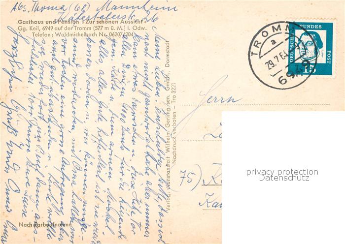 73860691 alte Postkarte Waldmichelbach Gasthaus Pension Zur schoenen Aussicht auf der Tromm Odenwald postalisch gelaufen Erhaltung siehe scans [FriedD77] KatCode: 11110006431021