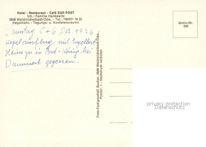 73725980 Waldmichelbach Hotel zur Post Restaurant Cafe Kegelbahn Postkutsche postalisch nicht gelaufen Erhaltung siehe scans [FriedD77] KatCode: 11110006431021