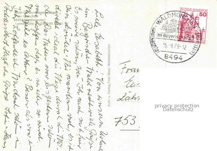 74049220 Waldmuenchen Cham Bayern Café Pension Sonnenhuegel am Waldrand postalisch gelaufen Erhaltung siehe scans [FriedD77] alte Postkarte Frie Katcode 11110009372171