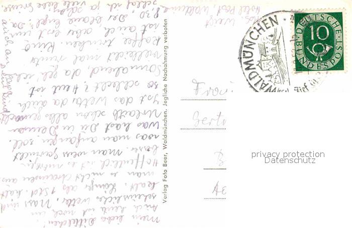 72823232 alte Postkarte Waldmuenchen Panorama mit Hirschstein Boehmerwald Teufelsbruecke Klammerfelskreuz Grenzhotel Freilichtbuehne Schloss Marktplatz postalisch gelaufen Erhaltung siehe scans [FriedD77] KatCode: 11110009372171