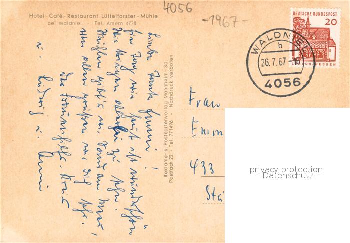 73852505 alte Postkarte Waldniel Hotel Cafe Restaurant Luettelforster Muehle Gastraeume postalisch gelaufen Erhaltung siehe scans [WerneD78] KatCode: 11110005166024