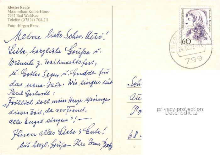 73083358 alte Postkarte Waldsee Bad Kloster Reute postalisch gelaufen Erhaltung siehe scans [KathaD81] KatCode: 11110008436009
