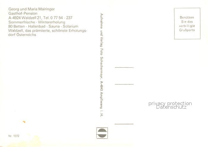 73588230 Waldzell Oberoesterreich Gasthof Pension Mairinger Hallenbad Bachlauf Kirche postalisch nicht gelaufen Erhaltung siehe scans [FriedD77] KatCode: 11390311041234