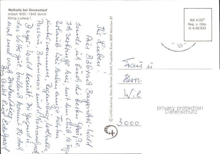 72510932 alte Postkarte Walhalla Fliegeraufnahme bei Donaustafu postalisch gelaufen Erhaltung siehe scans KatCode: 11110009375130