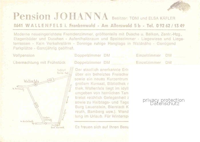 72841086 Wallenfels Oberfranken Pension Johanna postalisch nicht gelaufen Werbemarke (keine Postkarte) Erhaltung siehe scans [AndreD76] KatCode: 11110009476184