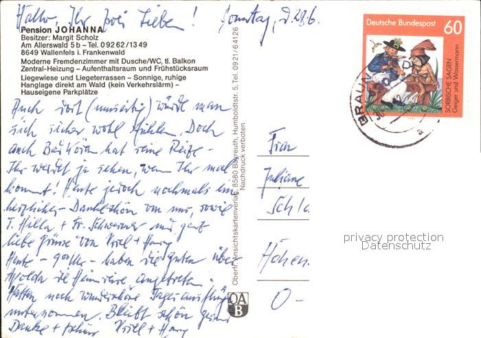 72448654 alte Postkarte Wallenfels Oberfranken Pension Johanna postalisch gelaufen Erhaltung siehe scans KatCode: 11110009476184