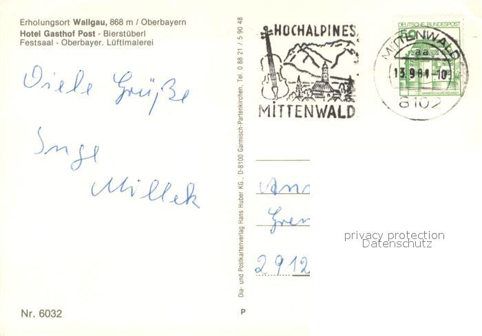 73636860 alte Postkarte Wallgau Gasthof Post Restaurant Festsaal Oberbayerische Lueftlmalerei postalisch gelaufen Erhaltung siehe scans [FriedD77] KatCode: 11110009180136