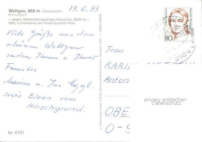 72447832 alte Postkarte Wallgau Hotel Gasthaus Post postalisch gelaufen Erhaltung siehe scans KatCode: 11110009180136